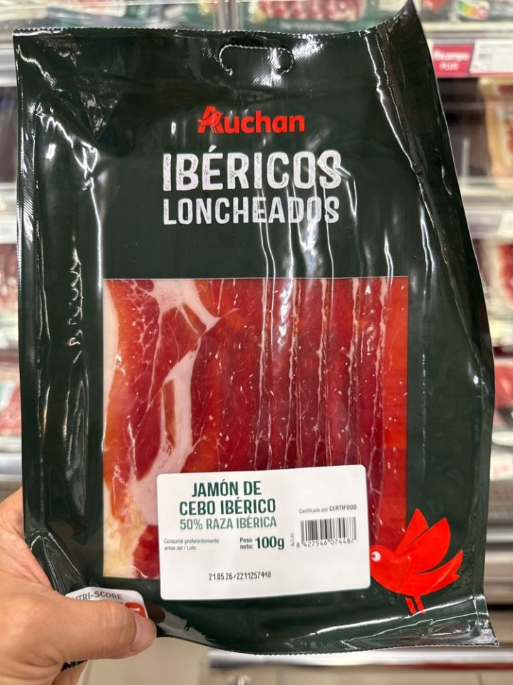 安い「緑パック(Paleta/前足)」は筋が多くて噛みきれないことがある。少し高くても「黒パック(Jamón/後ろ足)」を。脂が甘く、しっとりしていて、サンドイッチにしても最高。