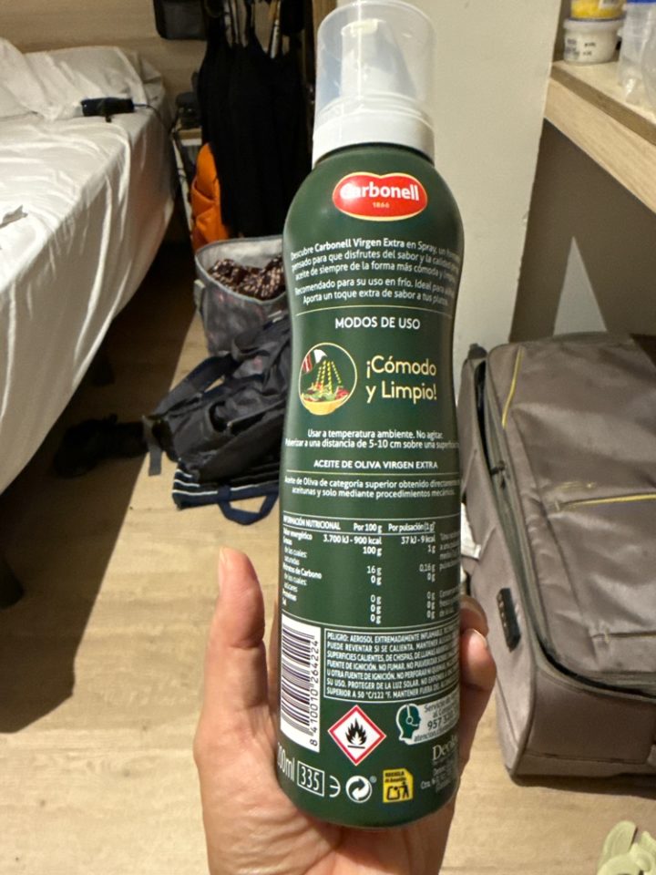 ★【失敗談】オリーブオイルのスプレー缶は「現地使い切り」で!(写真:スプレー缶)