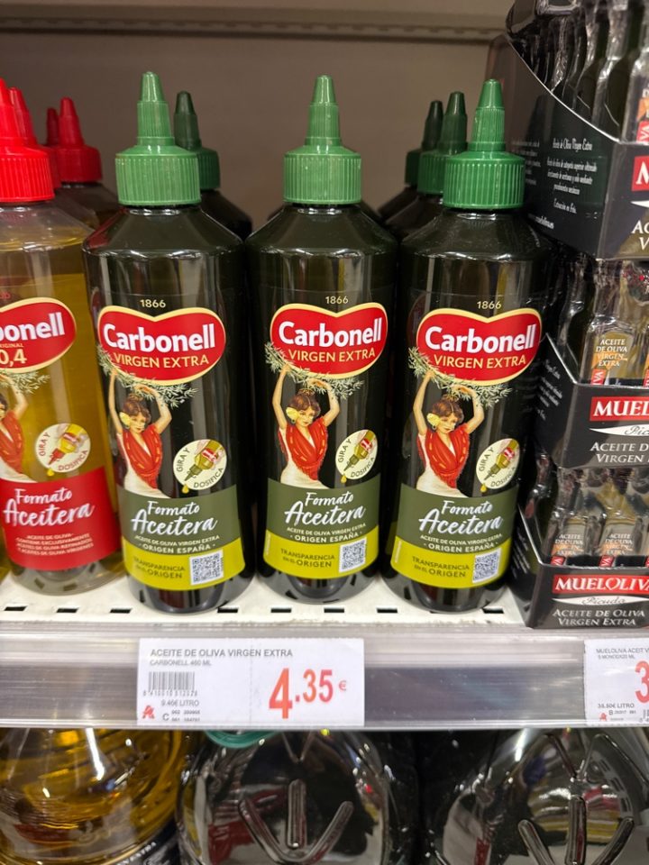 正解はこちらの「Aceitera(アセイテラ)」と書かれたボトル。注ぎ口が細くなっていて、ドバっと出ない。プラスチック製で軽く、蓋もしっかり閉まるので、これこそが旅行者のベストバイ!