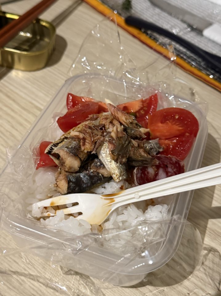 現地調達のパックご飯+サバ缶+生胡椒。