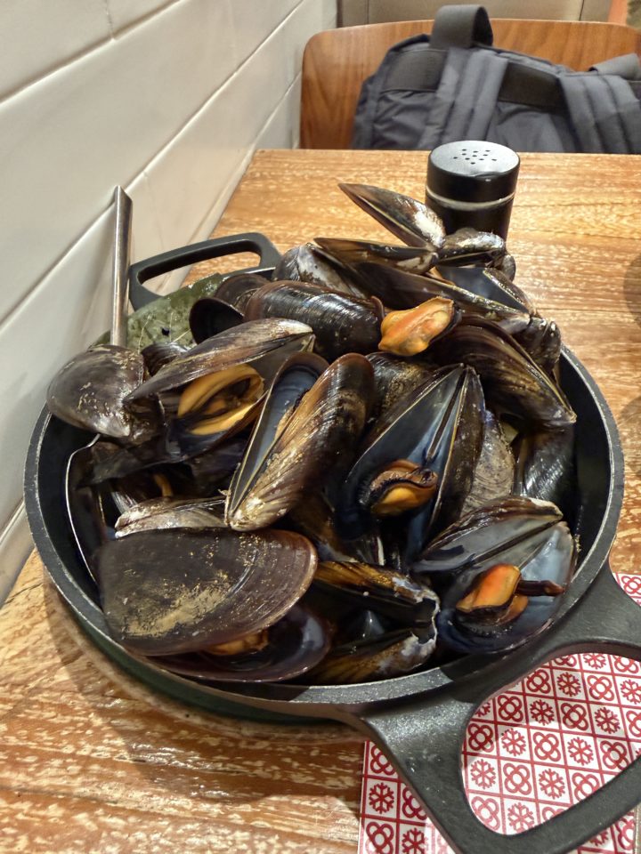 まずは前菜のムール貝が運ばれてきた。 「多い!」 当たり前だが、本当にムール貝だけ。これをどう食べるのが正解なのだろう。 本来ならワインと一緒に楽しむものかもしれないが、手元にあるのは炭酸水。 ひとつひとつ丁寧に開いて、目を閉じて「ん〜」と言いながら食べるべきなのか? 正解がわからず緊張してしまい、味もよくわからないまま、とにかく食べ続けた。