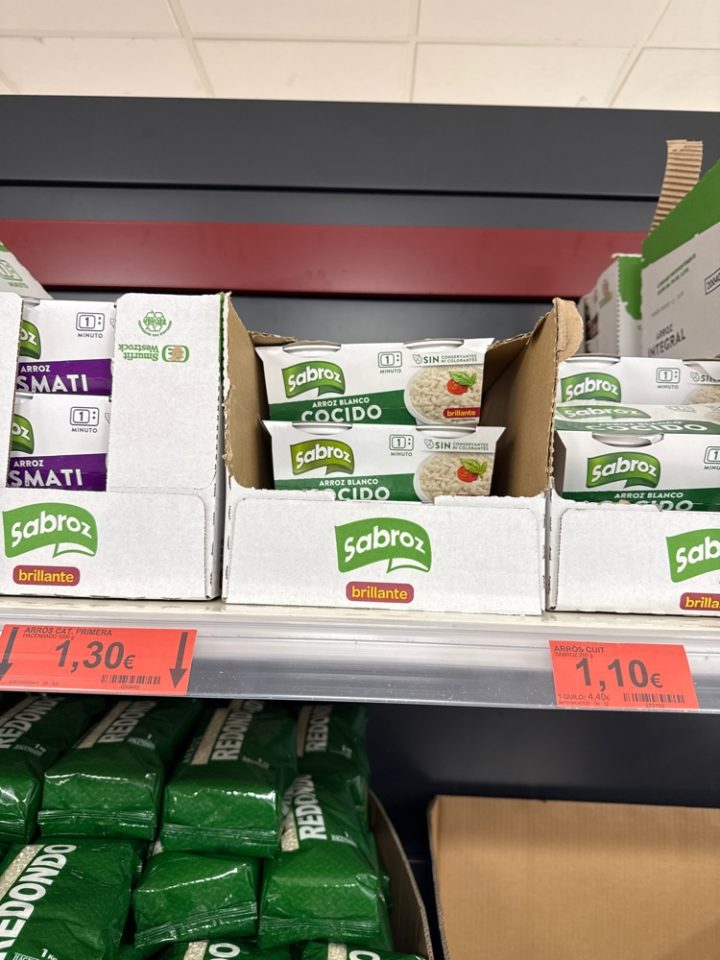 ★現地調達の裏技 「お米はどうする?」と心配な方へ。スペインのスーパーにも「Sabroz」などの「チンするご飯」が売っている。日本から大量のパックご飯を担いでいく必要はない!